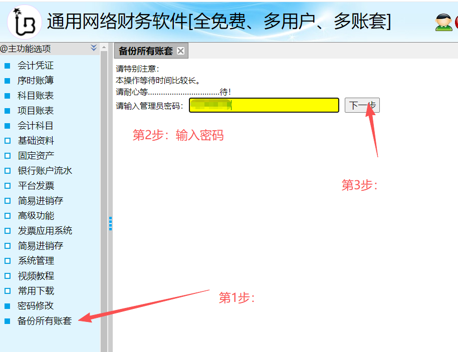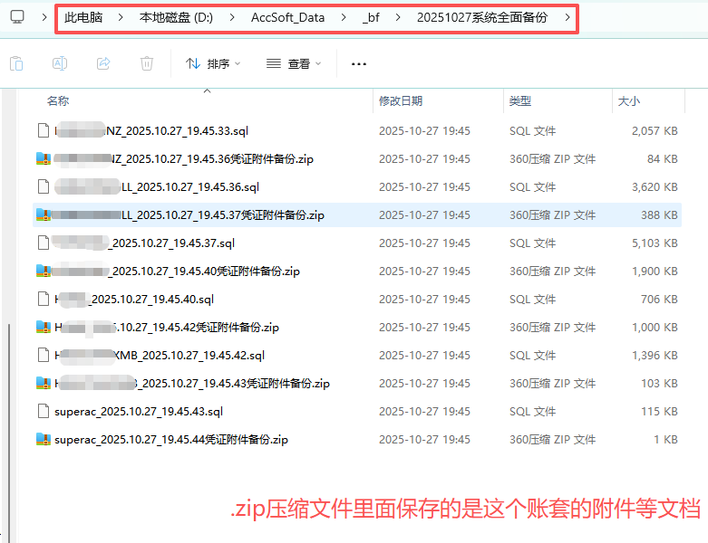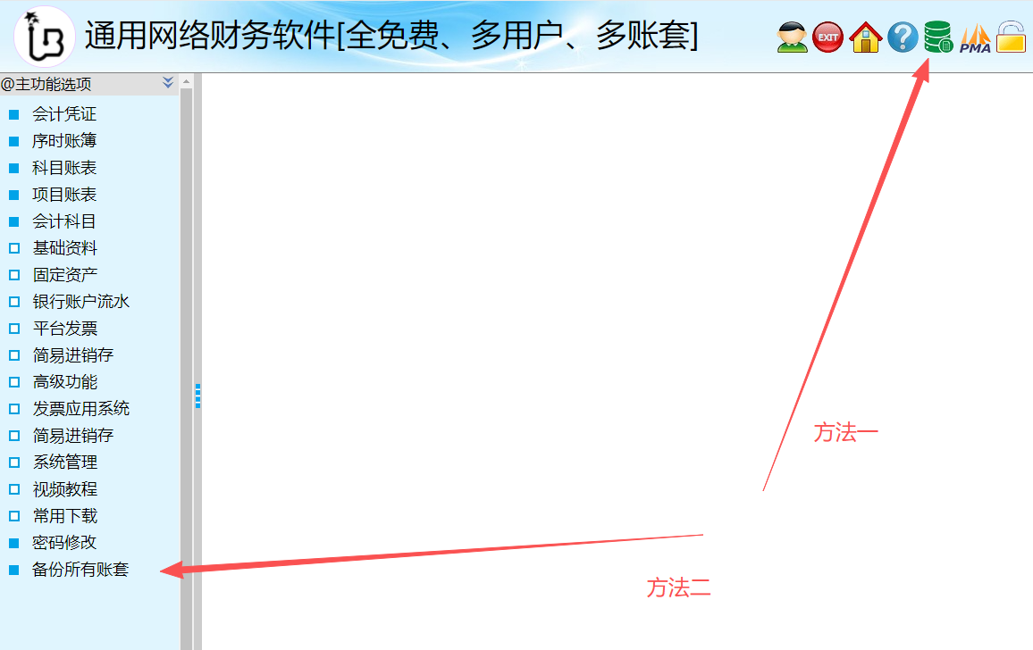2、备份方法二(如下图):备份系统内的所有账套,并同时备份所有的凭证附件。