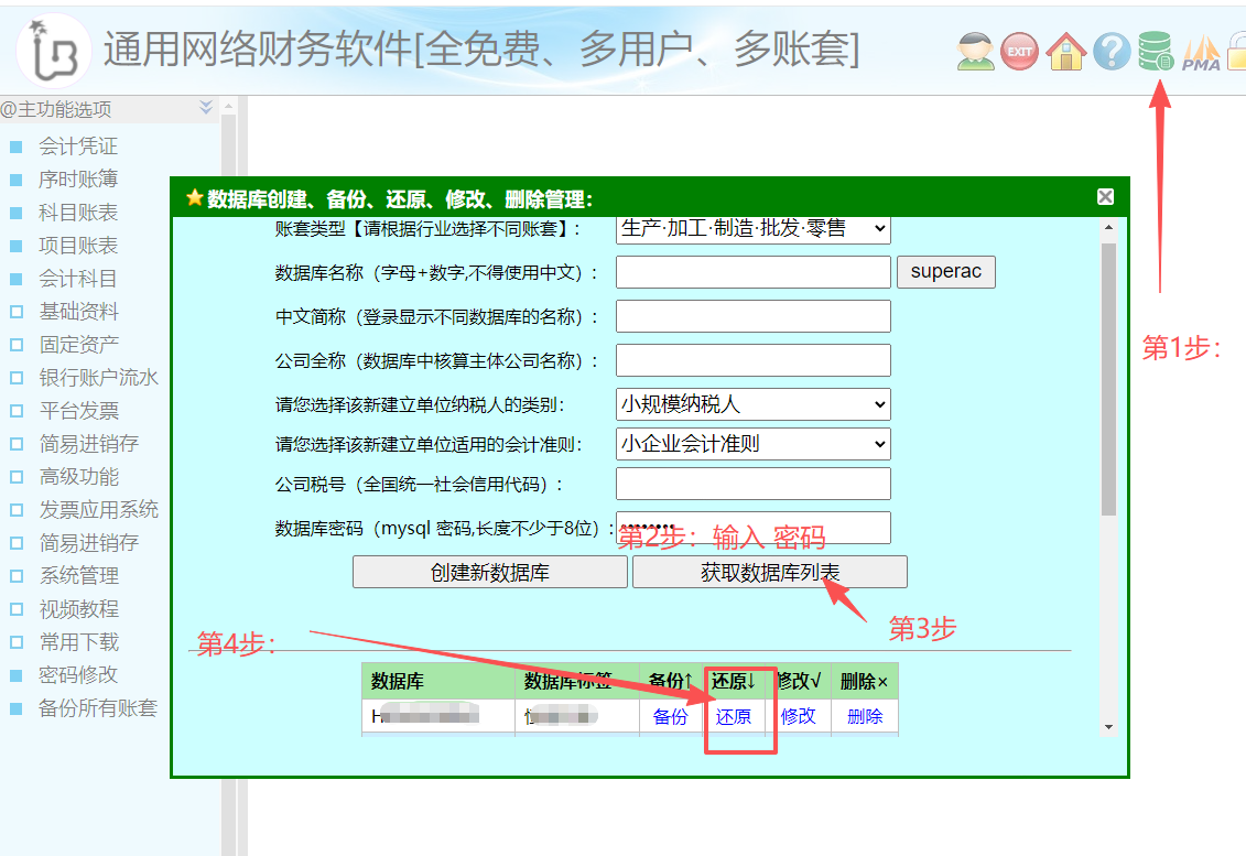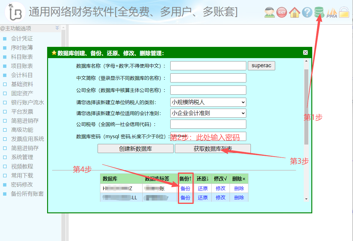 7、我们可以采用如上的方法再创建不限数量的数据库账套,只不过不需要使用“superac”按钮了。