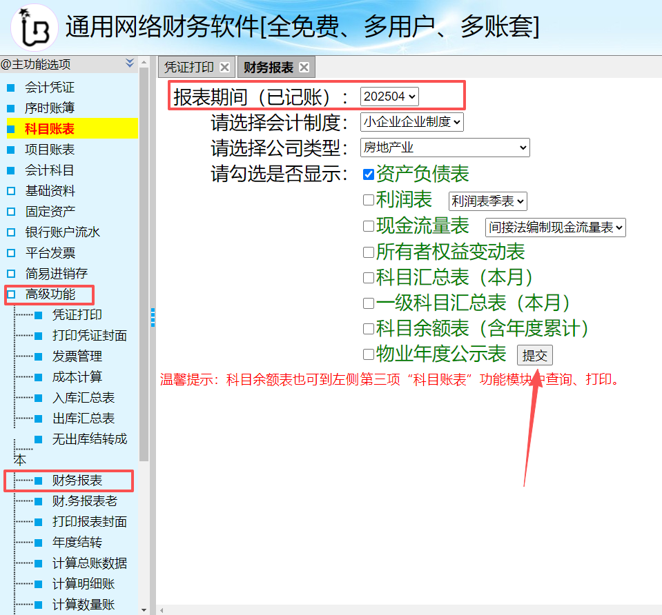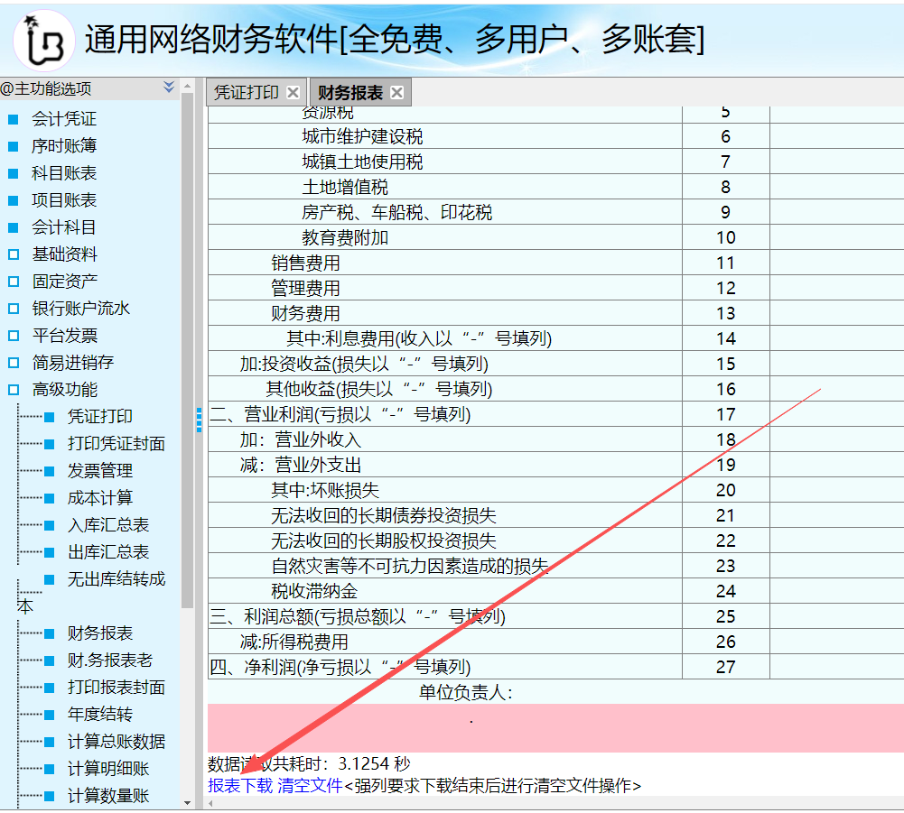 财务报表生成后,可以点击下方的“报表下载”。