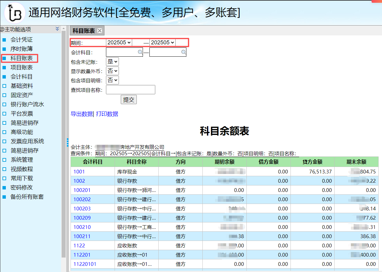 1、科目账表:科目账表主要用于展示会计科目余额、发生额数据(如下图):