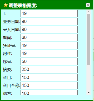 右键单击“科目余额表”表格头部信息时,弹出列宽设置,可根据需要对表格列宽进行设置,保存列宽信息后再次查询时生效(如下图):