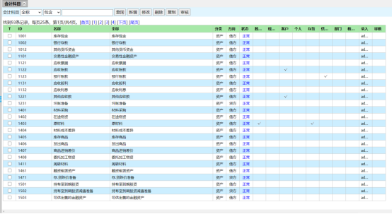 会计科目是账务处理的基础,账套创建时会自动创建一套会计科目数据,会计科目管理界面(如下图):