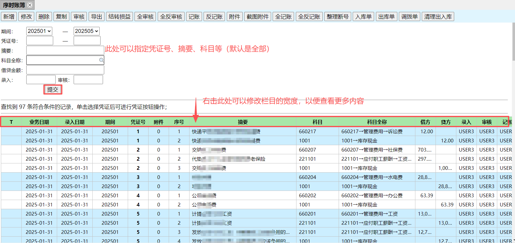 (1)修改、删除记账凭证:请在上图中先选择相应的会计期间,填写相关的摘要、科目之类的(也可以不填写,系统默认为所有),提交一下。如下图
