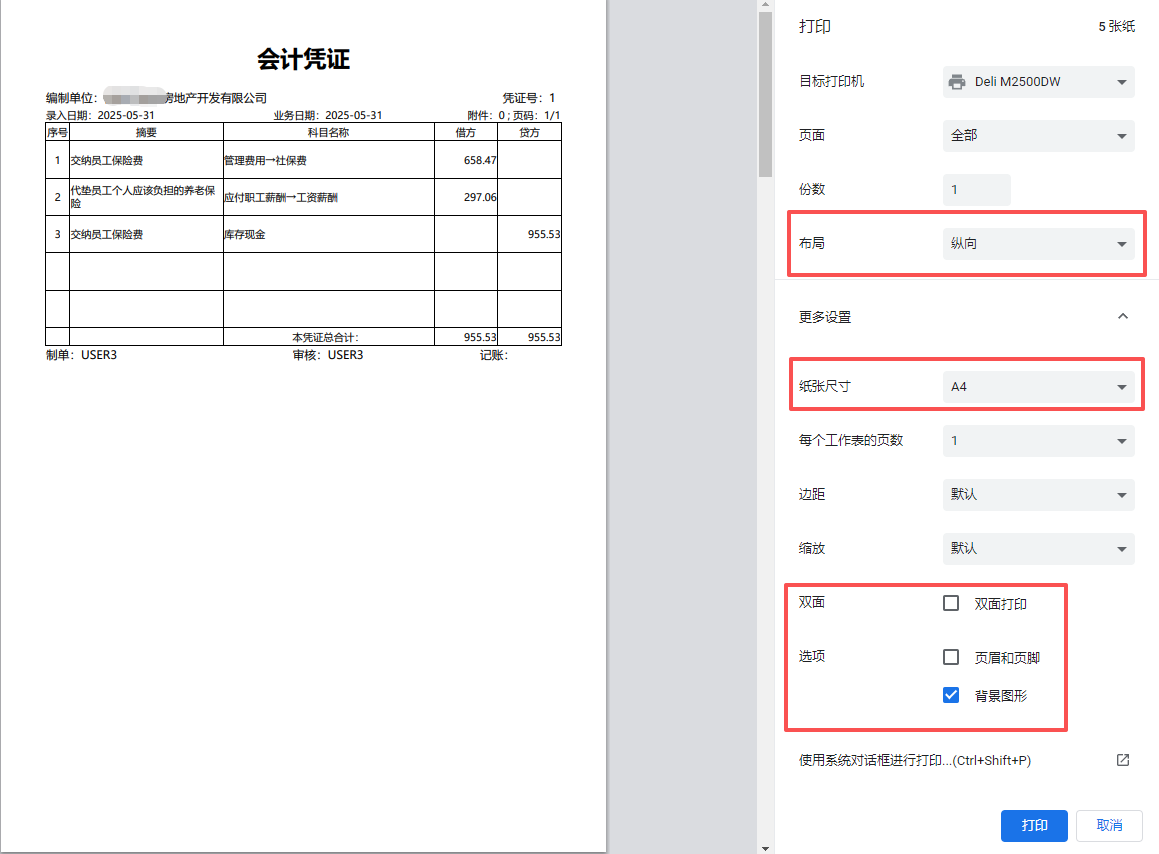 打开凭证打印功能,点击“生成”按钮,则会生成凭证打印模板样式(如下图):