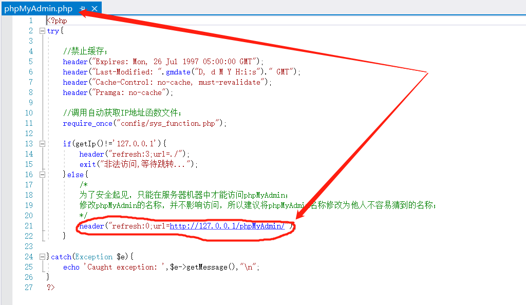 二、如果选择了安装phpMyAdmin,可以通过更改phpMyAdmin文件夹的名称,然后修改phpMyAdmin.php文件中路径跳转代码(如下图):