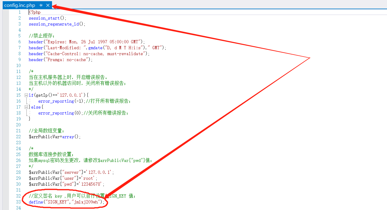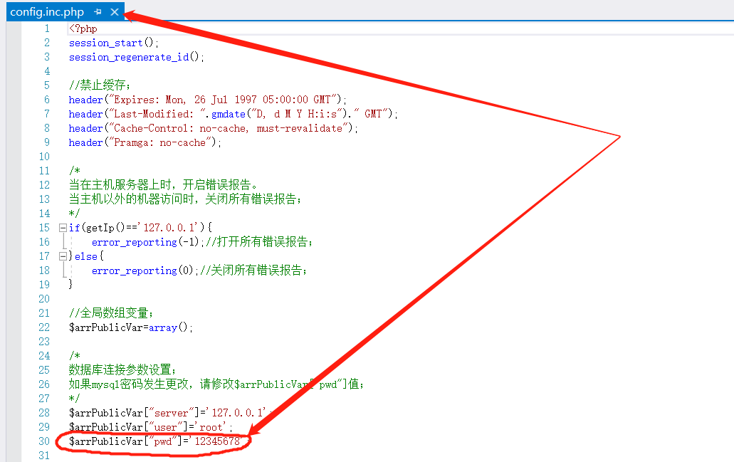 三、将mysql的密码设置了更复杂,同时修改程序文件config.inc.php中的密码(如下图):