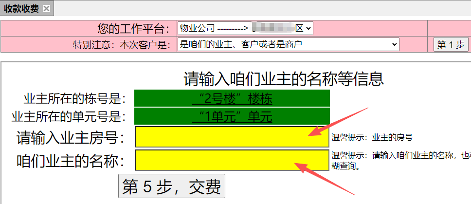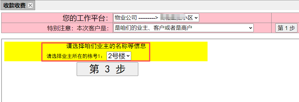 3、选择小区名称后,选择本次收费是不是咱们的业主(客户或者商户)?(如下图):