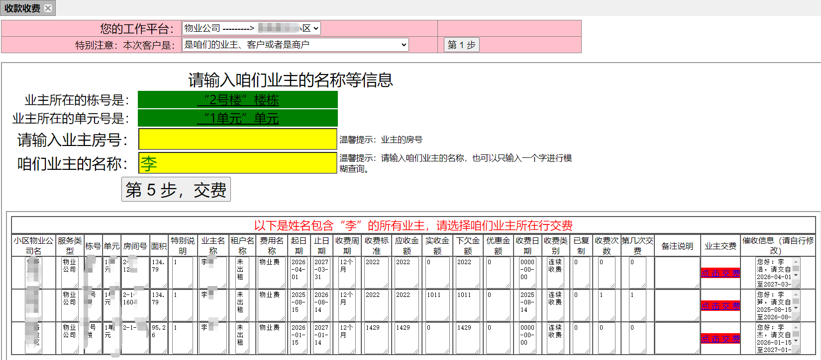 7、请输入业主的房号或者输入业主的名称,也可以只输入一个字进行模糊查询。如下图