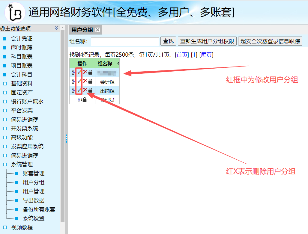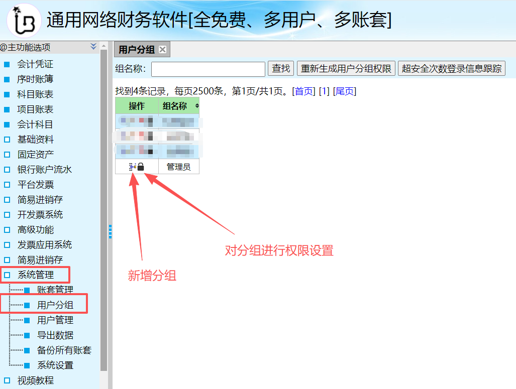 (1)新建分组:登录“集团账套superac”,点左侧“系统管理”→“用户分组”,出现如下图,请点击“新增分组”: