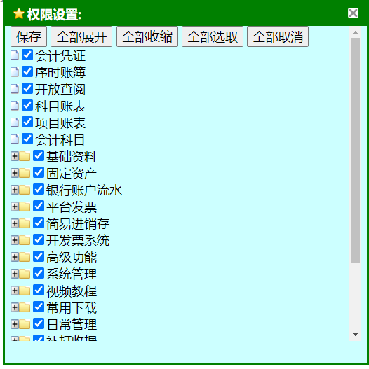 如上图“管理员”组是系统默认组,不可修改与删除,只可对其进行权限的设置,点击操作列中锁型图标,弹出权限设置功能(如下图)。勾选菜单,点击“保存”按钮,赋于该组打开权限,如果不勾选菜单,在主功能选项中菜单将不能显示,并且无法打开。